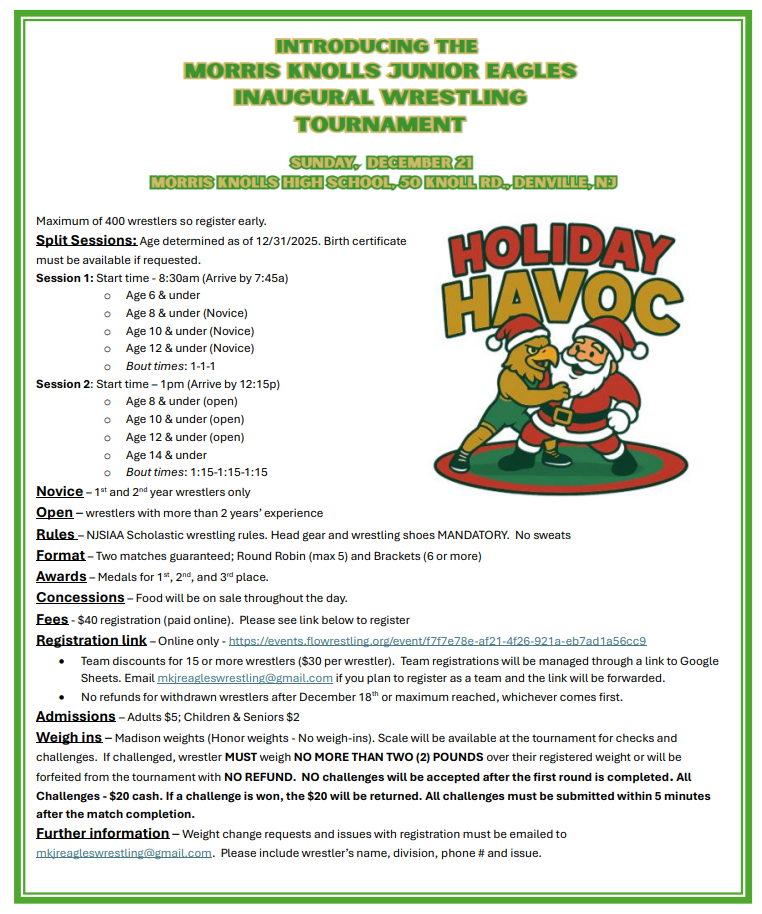 Morris Knolls JV & Varsity Holiday Tournament Morris Knolls High School 50 Knoll Drive Rockaway, NJ 07866 |
